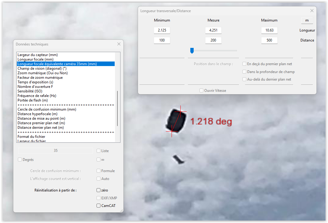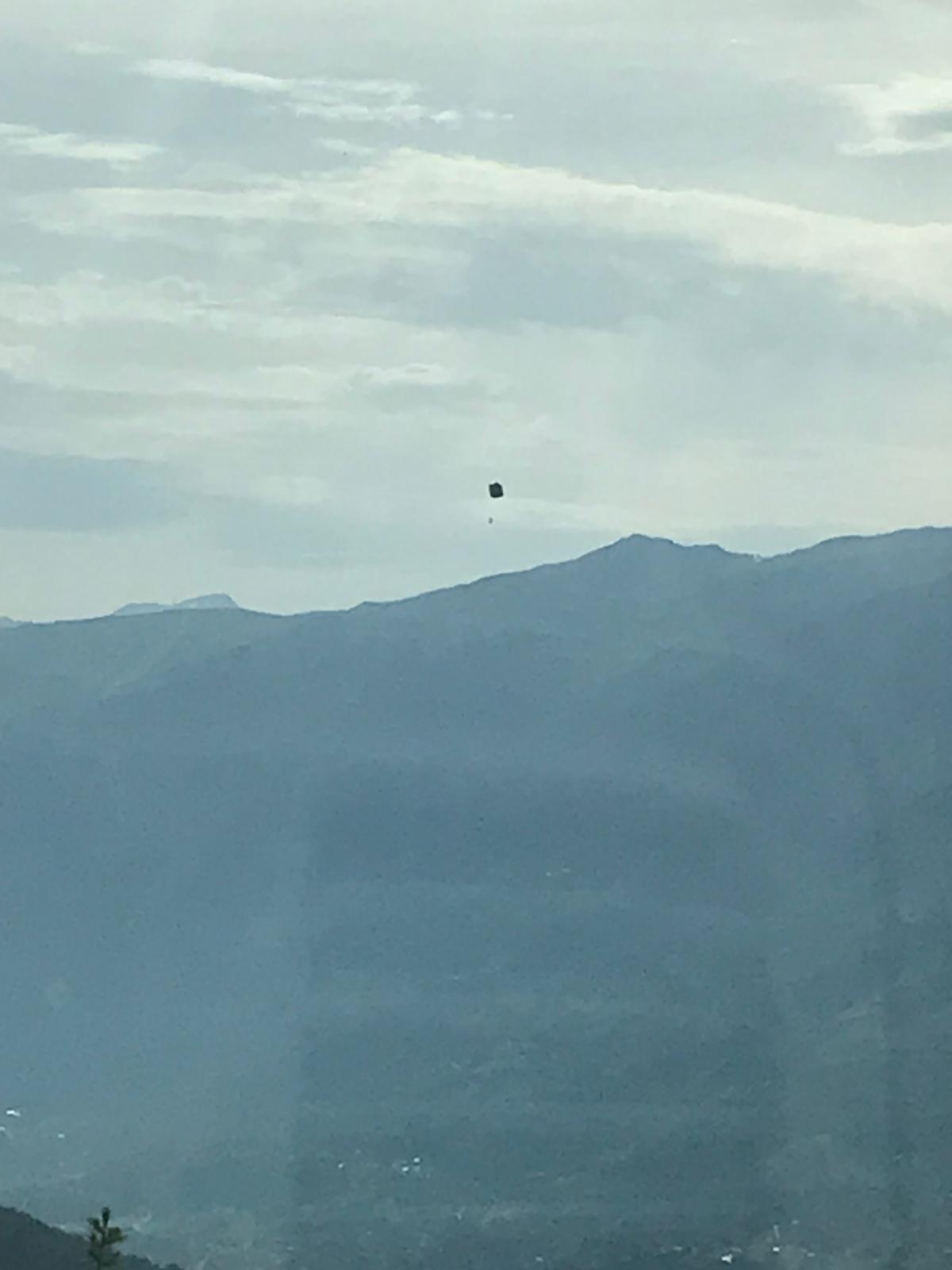 L'analyse photographique nuance toutefois certains éléments de la description. Sur les images, l'objet ne présente pas les caractéristiques géométriques d'un cube rigide : aucune arête franche ni structure anguleuse n'est visible. Sa forme apparaît plutôt rectangulaire aux bords arrondis, évoquant davantage une surface souple ou une enveloppe textile que des parois métalliques. L'élément suspendu est bien visible et confirme une configuration objet principal avec charge, classique dans les dispositifs aérostatiques tels par exemple un parapente. Une estimation géométrique basée sur les caractéristiques de l'appareil photo et la taille apparente de l'objet dans l'image indique une dimension angulaire d'environ du double de celle de la Lune (~1,2°). En retenant une fourchette de distances possibles incluant l'estimation du témoin (entre 100 m et ~500 m) et l'estimation de l'élévation angulaire donnée par le témoin, soit environ 15°, on obtient une altitude comprise entre environ 26 et 140 mètres au-dessus du point d'observation, et une taille réelle probable comprise entre environ 2 et 10 mètres, cette valeur étant cohérente avec les dimensions d'une voile de parapente (voir annexe 1 : analyse par outil IPACO*).