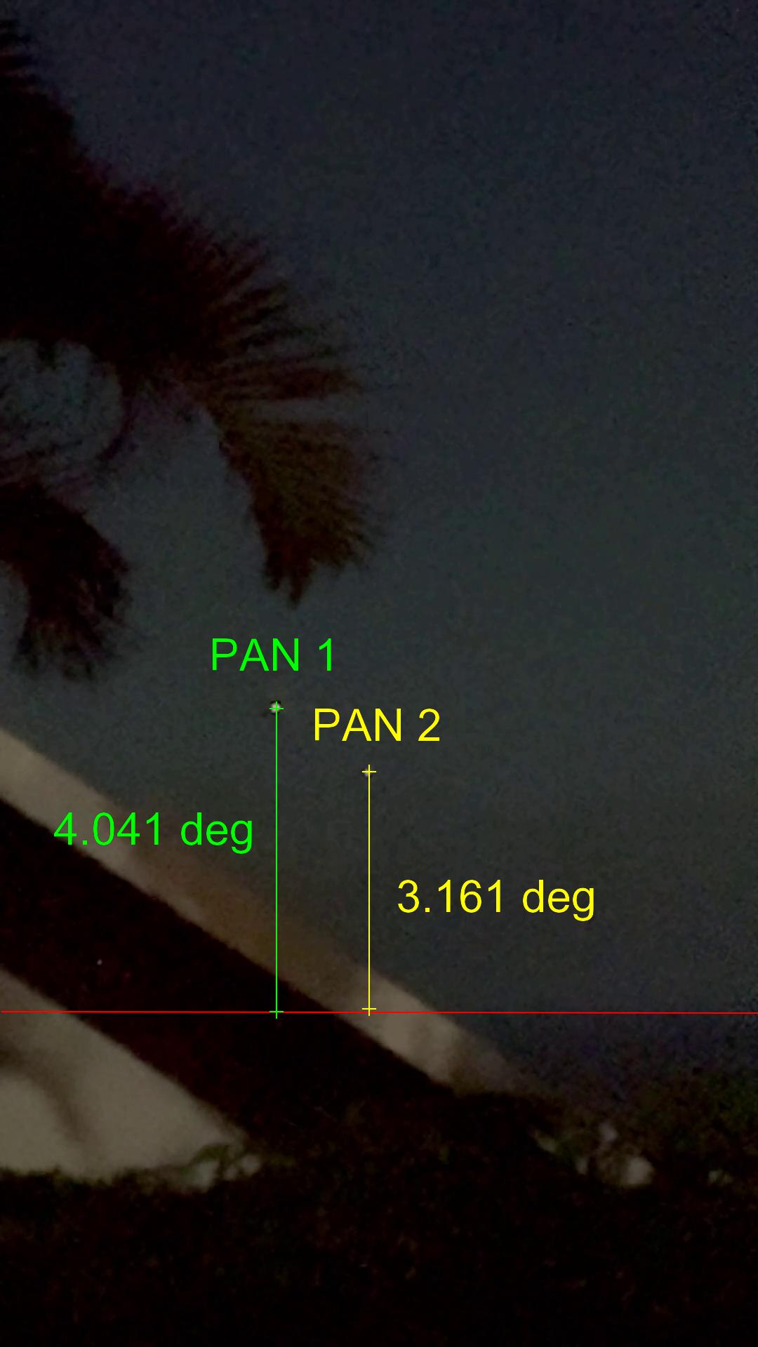 • L'élévation de 30°, relevée par le témoin est surestimée car l'analyse avec l'outil de traitement d'image du GEIPAN, IPACO®, d'une des vidéos où apparaissent 2 PANs, permet de quantifier les élévations respectivement à 3,1 et 4° (voir annexe 1). La surestimation de la valeur par le témoin semble en partie liée à l'utilisation du zoom (x5).