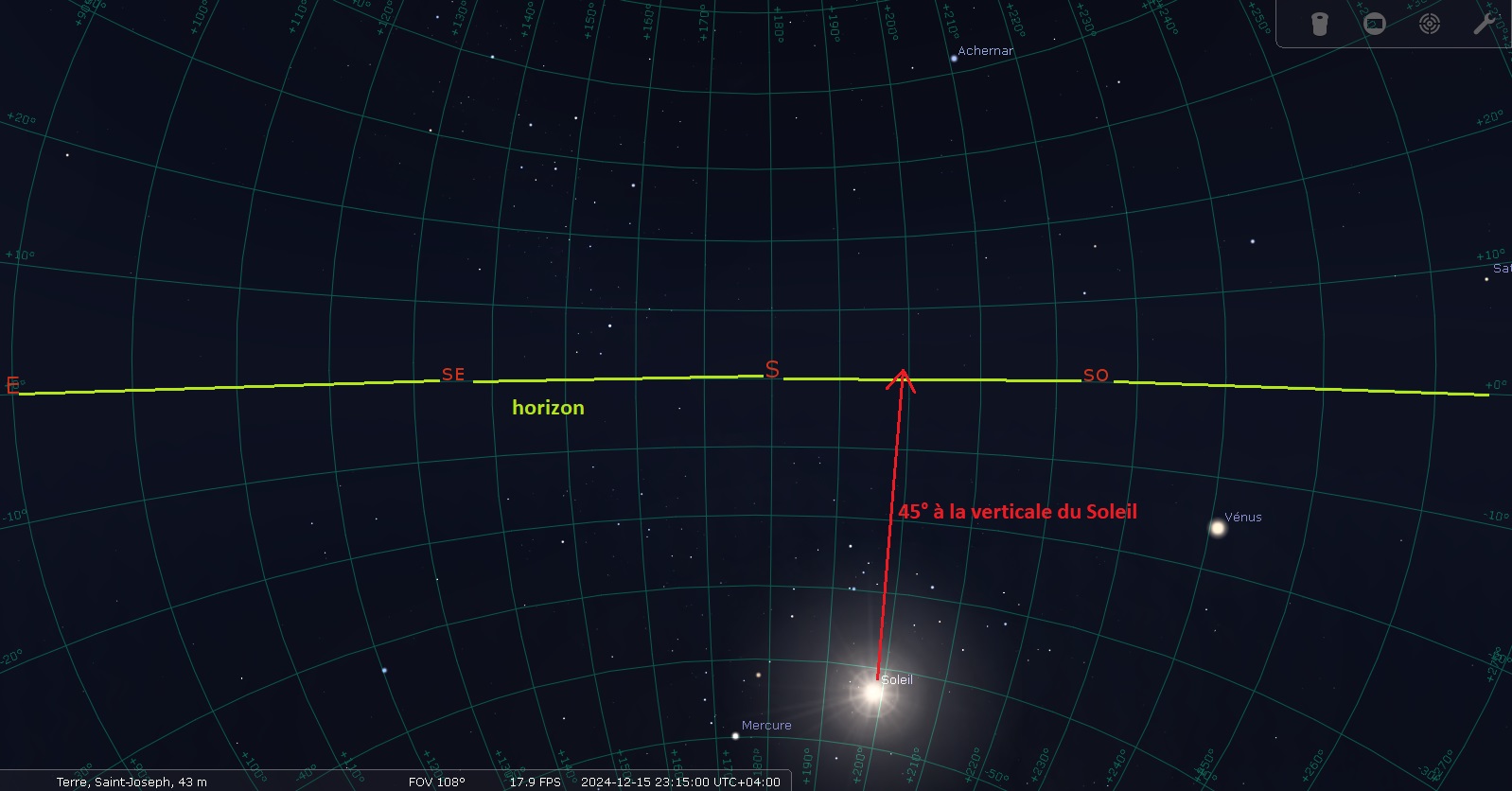 • Une vérification sur Stellarium permet de confirmer qu'à l'heure de l'observation, le Soleil se trouve également vers le sud, entre 30 et 45° sous l'horizon (voir annexe 2).