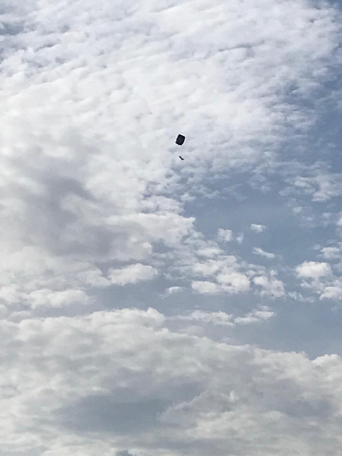 Le témoin décrit l'objet comme une structure cubique et creuse, de teinte gris foncé à l'aspect métallique, portant sous elle un élément assimilé à une planche reliée par un fil. L'ensemble est perçu comme silencieux, immobile ou dérivant très lentement, porté par le vent, sans clignotement, halo ni émission lumineuse.